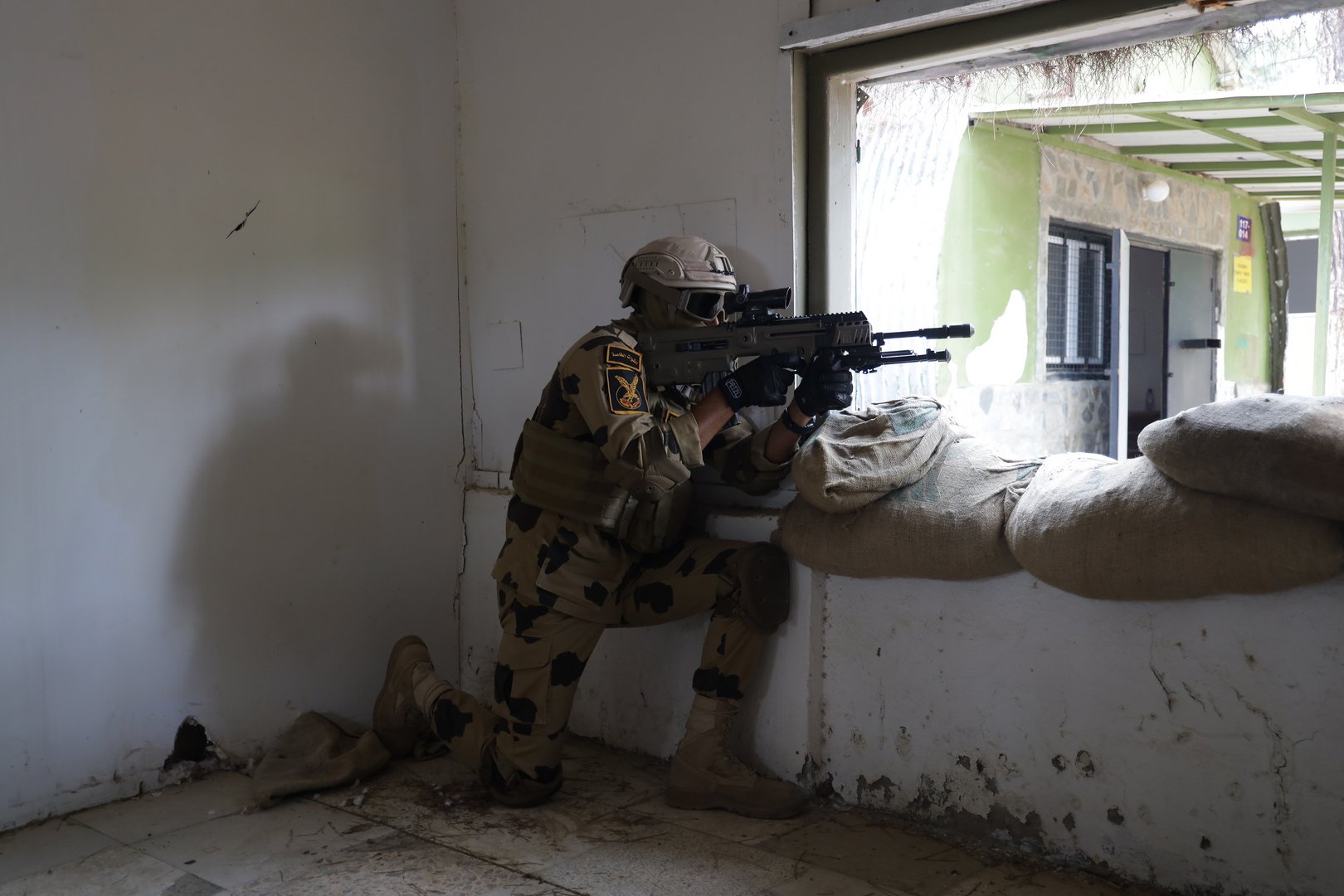 The drill emulated a scenario that included the clearing of abandoned houses occupied by enemy forces, and included rapid reaction shots, combat within residential areas, sniper precision shots and provision of first aid on the battlefield.