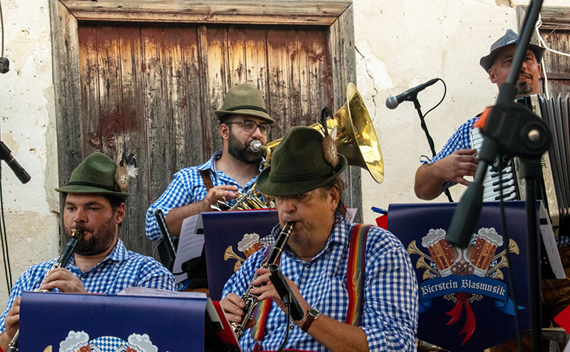 The style has been long associated having a jolly good time, “a knees up, with plenty of beer drinking and typical Bavarian food (including bratwurst, sauerkraut and pretzels),” says Steve. “In fact, that’s where the band’s name comes from: ‘Bierstein’ meaning beer mug, and ‘Blasmusik’ translating as brass band.”