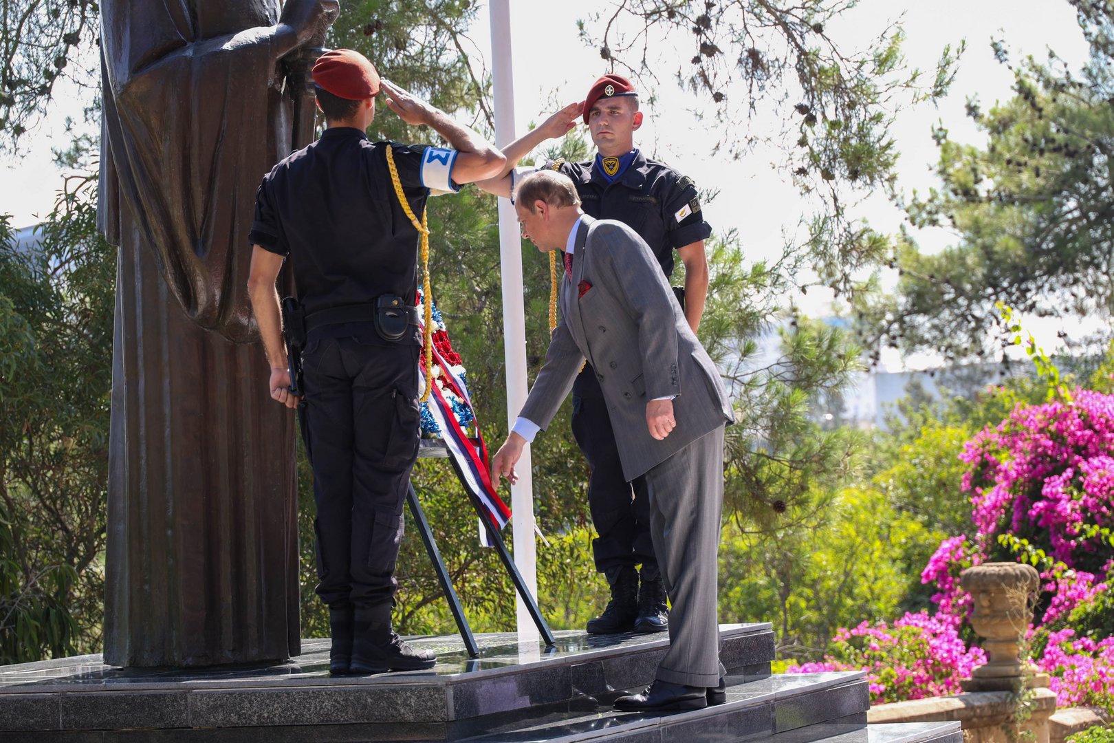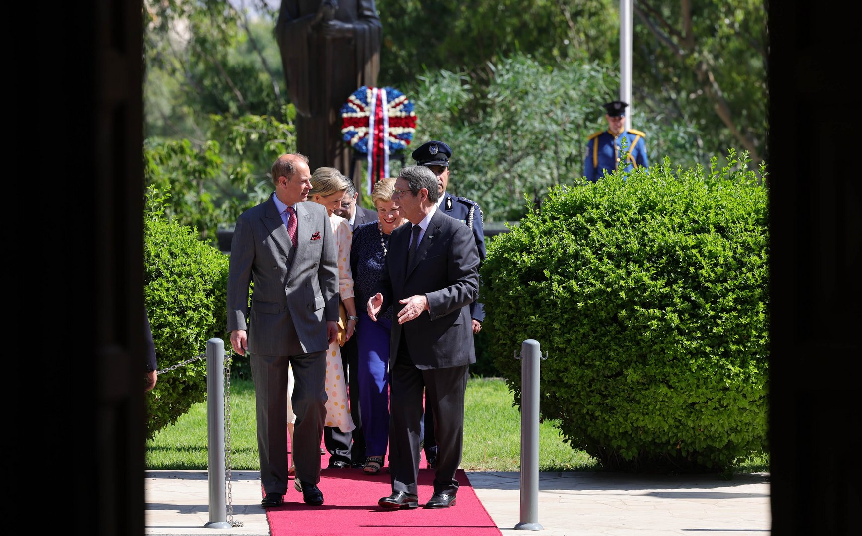 Prince Edward, who was congratulated by Anastasiades for his 23rd wedding anniversary with his wife Sophie, laid a wreath at the Archbishop Makarios III statue on arrival to the Presidential Palace.