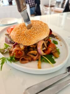 We selected one of their Angus Burgers (they have a choice of three versions) and Spinach Cannelloni. My partner described the Angus Burger as an experience more like eating a steak than a typical burger which reflects the high-quality ingredients. They asked how he wanted it to be cooked. The burger came in a bun, and inside, it was topped with a rich sauce and lots of onions. A generous bowl of thin French fries was also served. The pasta arrived with a fresh Greek salad and was a substantial portion in typical style. The kind of meal you would dream about when you cut out carbs. All the food was piping hot.