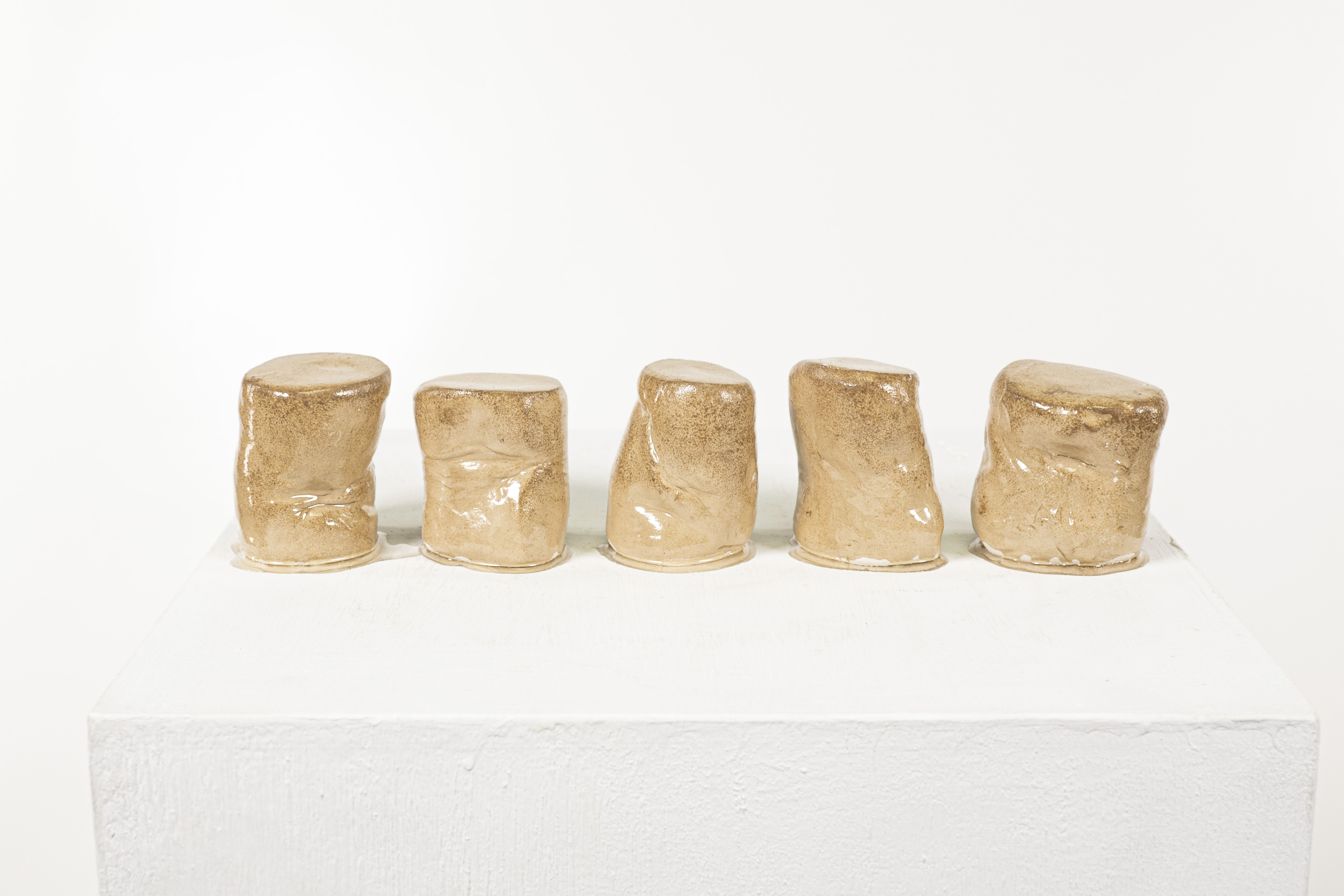 The exhibition consists of sculptures and installations yet includes various formats and materials such as painted glassine vellum paper sculpture in an installation format and sculptural work made with clay or liquid glass. The artworks appear as abstract objects, anonymous in appearance, and have a strong material presence that bears witness to the creative process and stimulates bodily senses. The exhibition is accompanied by an ASMR soundscape that functions as a starting point for the expansion of the viewer’s sensorial possibilities.