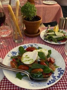 Onto the food. Bar the extensive choice of pasta dishes – we’ll get there – the menu is not huge. A few ‘antipasti’ (starters, if you must), a handful of traditional salads, such as the evergreen ‘caprese’ with basil, tomato and mozzarella, some meat entries all’italiana, namely the breaded chicken found in every restaurant from Venice to Rome and four or five desserts.