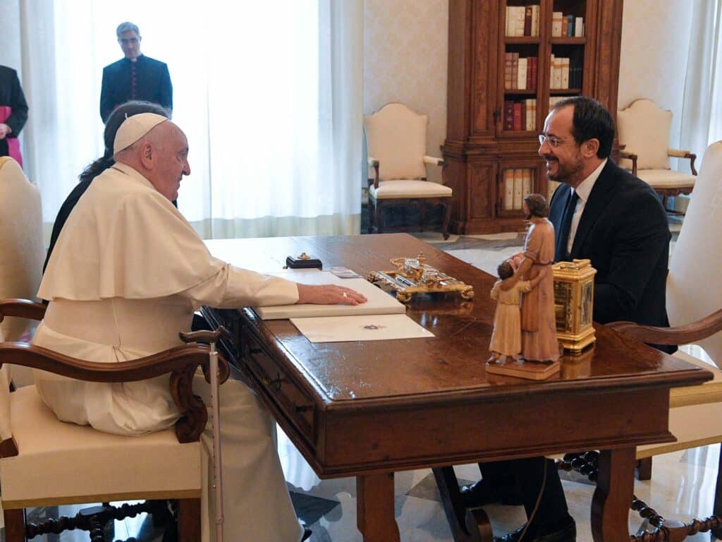 President Nikos Christodoulides met Pope Francis on Friday at the Vatican, accompanied by his wife Philippa Karsera and Cypriot officials.