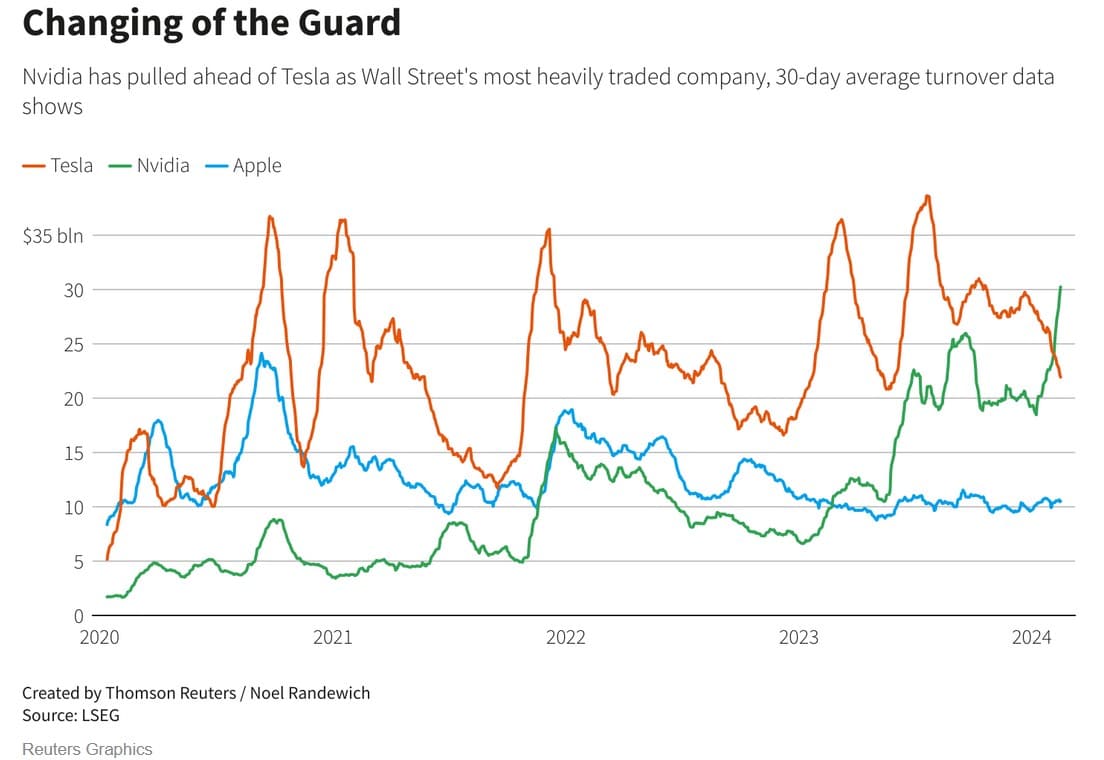 Chipmaker Nvidia (NVDA.O) is replacing Tesla (TSLA.O) as Wall Street’s most traded stock, adding to its prominence after becoming the third-most valuable US company and showing more evidence of how central AI-related bets have become to investors.