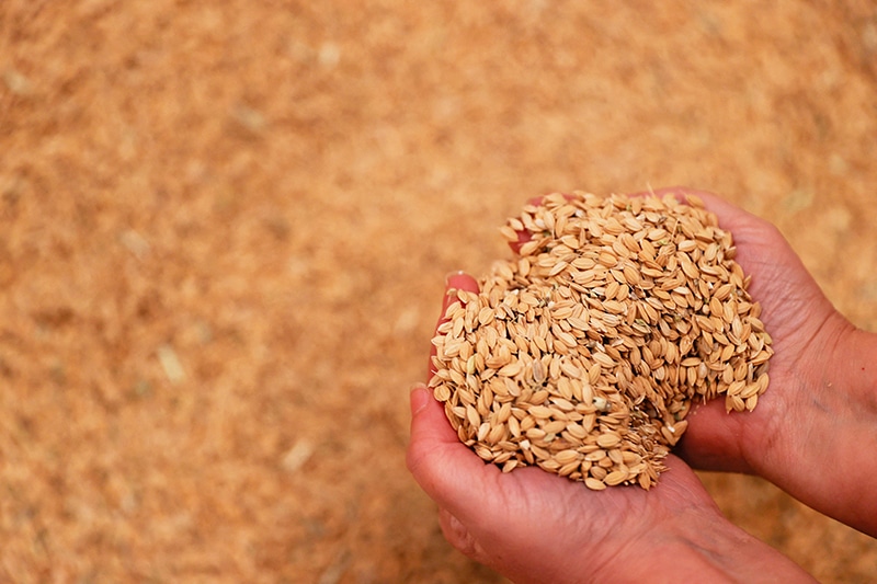 A handful of bomba rice is pictured in the barn before going to the mill, in Sollana, Valencia, as rice farmers in the Valencian Community say their harvest of bomba rice, a variety grown almost exclusively in Spain, has been affected by EU environmental regulations in Spain, February 7, 2024. REUTERS/ Eva Manez
