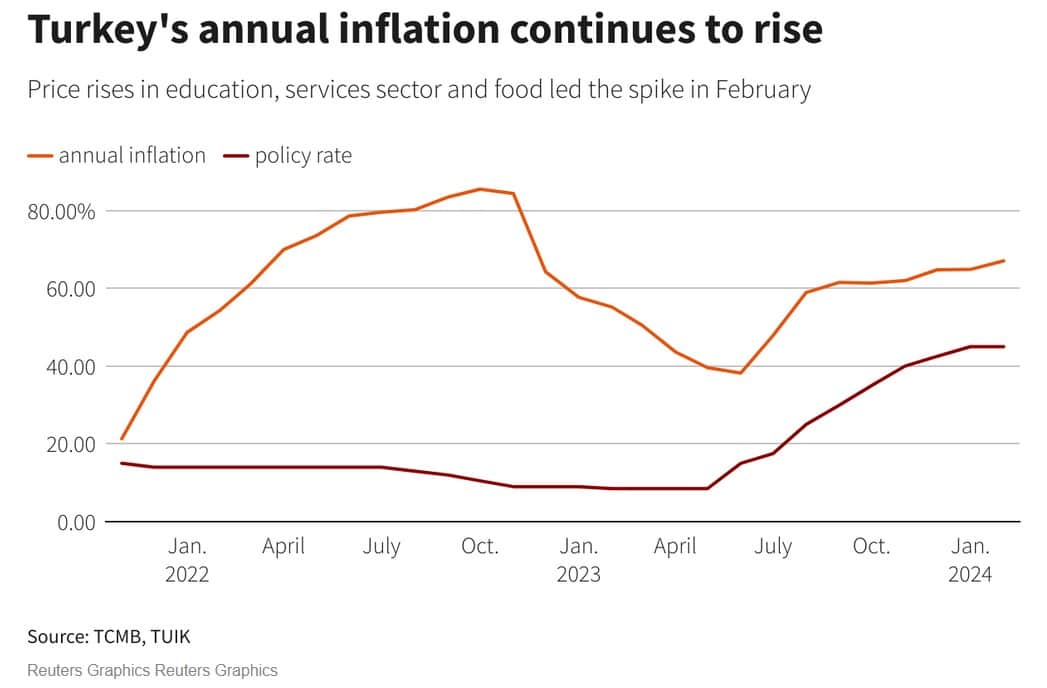 Turkey’s annual inflation rate climbed to 67.07 per cent in February, exceeding expectations and keeping up pressure for tight monetary policy amid strong rises in food, hotel and education prices, official data showed on Monday.