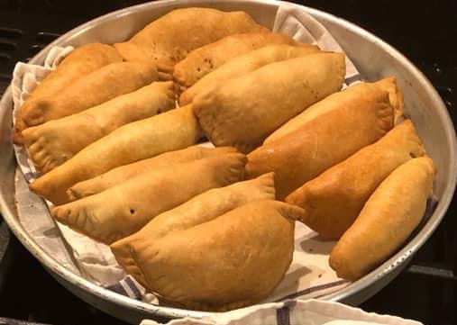 Roll each ball on a lightly floured surface to about the thickness of a one euro coin. You can use a small cup saucer, upside down as a measure to cut them approx 15cm each. Roll the discs again to stretch the pastry and place about 2 large tablespoons of the filling into the centre of each disc, fold over into a half moon, press the edges together and crimp the edges or seal them with a fork.