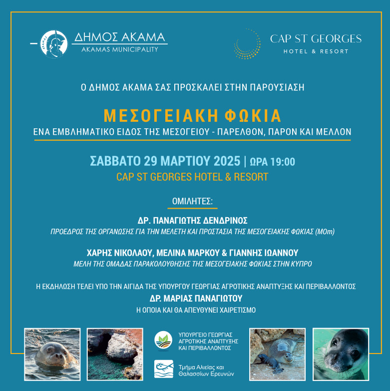 The event will also feature speeches by members of the Mediterranean Seal Monitoring Team in Cyprus – Melina Marcou, Haris Nicolaou and Giannis Ioannou – who will report on the local picture, challenges and prospects for the conservation of the species on the Cypriot coast.