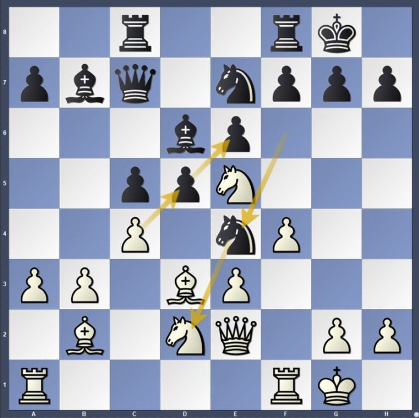 In the seventh round in the game between Olga Badelka and Anna Muzychuk, the tournament leader made a move 14…Ne4, intending to exchange knights after 15. cd Nxd2. However, the 22-year-old native of Mogilev, who has been playing under the Austrian flag since January 2025, stunned her opponent with 16. de!!!, not only not taking the knight, but also leaving her rook in the fight.