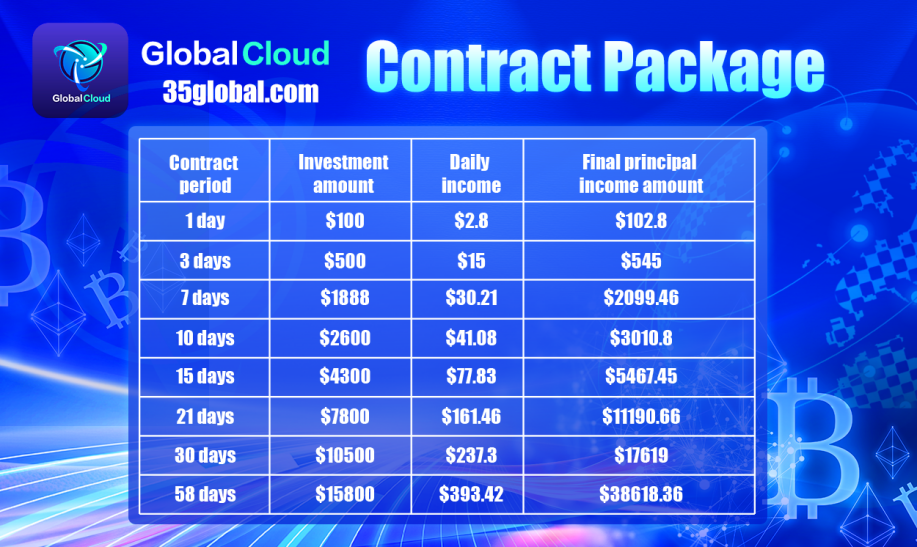 With the booming cryptocurrency market, Global Cloud Mining is leading the industry revolution with innovative and efficient cloud mining solutions. Whether you are a novice to cryptocurrency or an experienced investor, Global Cloud Mining can provide you with an easy-to-use platform, top security and super high profit potential to help you easily realize wealth appreciation.
