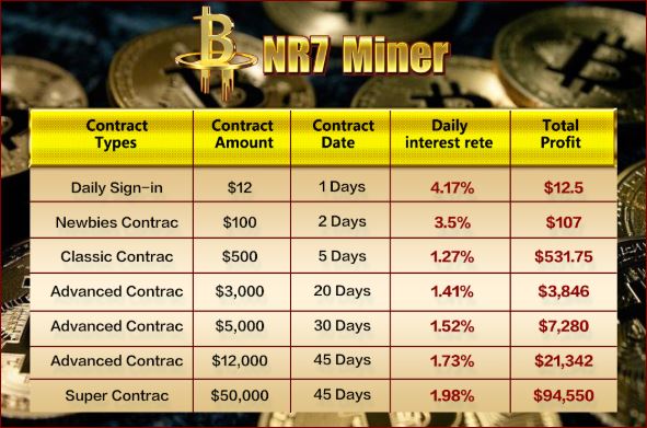 Visit NR7miner.net, fill in your username, email and password to open an account, and immediately get $12 in start-up funds + free trial contracts, and zero-cost trial mining income.