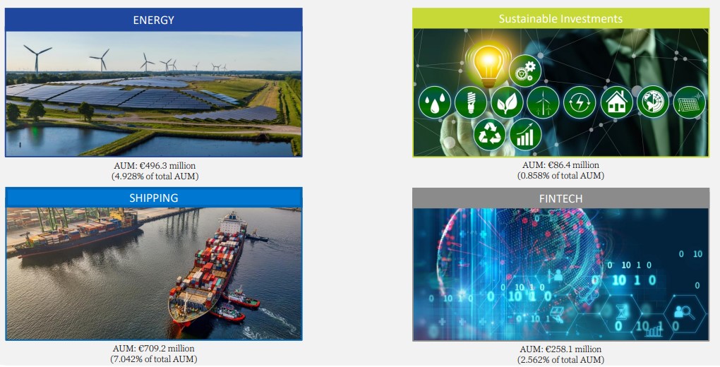 Sector-specific investment figures reveal that €709.2 million (7.042 per cent of total AUM) was allocated to the shipping sector, €496.3 million (4.928 per cent) to energy, €258.1 million (2.562 per cent) to fintech, and €86.4 million (0.858 per cent) to sustainable investments.