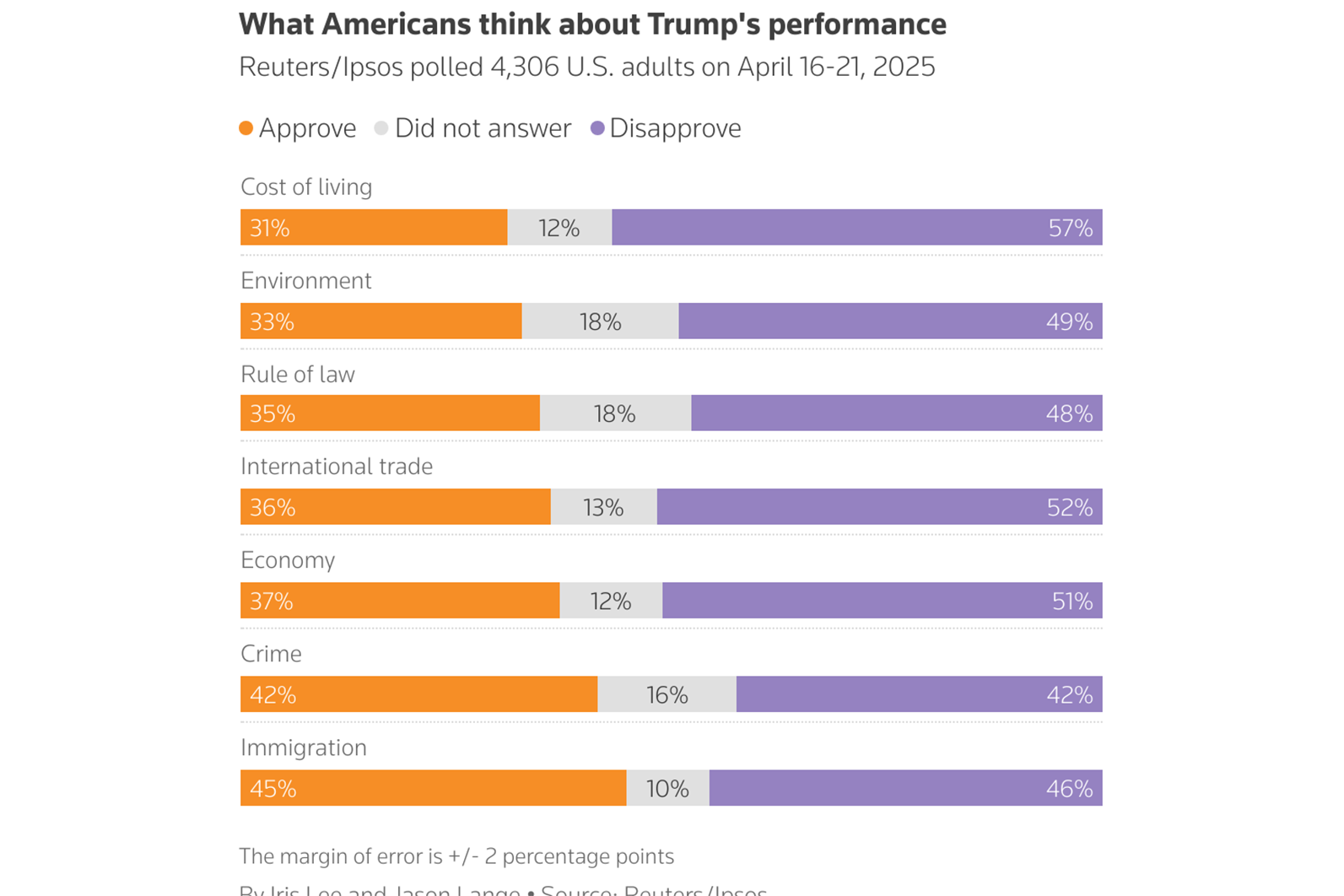 But even one in three Republicans said their cost of living was on the wrong track, according to the poll, which surveyed 4,306 U.S. adults nationwide between April 16 and April 21. The poll had a margin of error of about 2 percentage points.