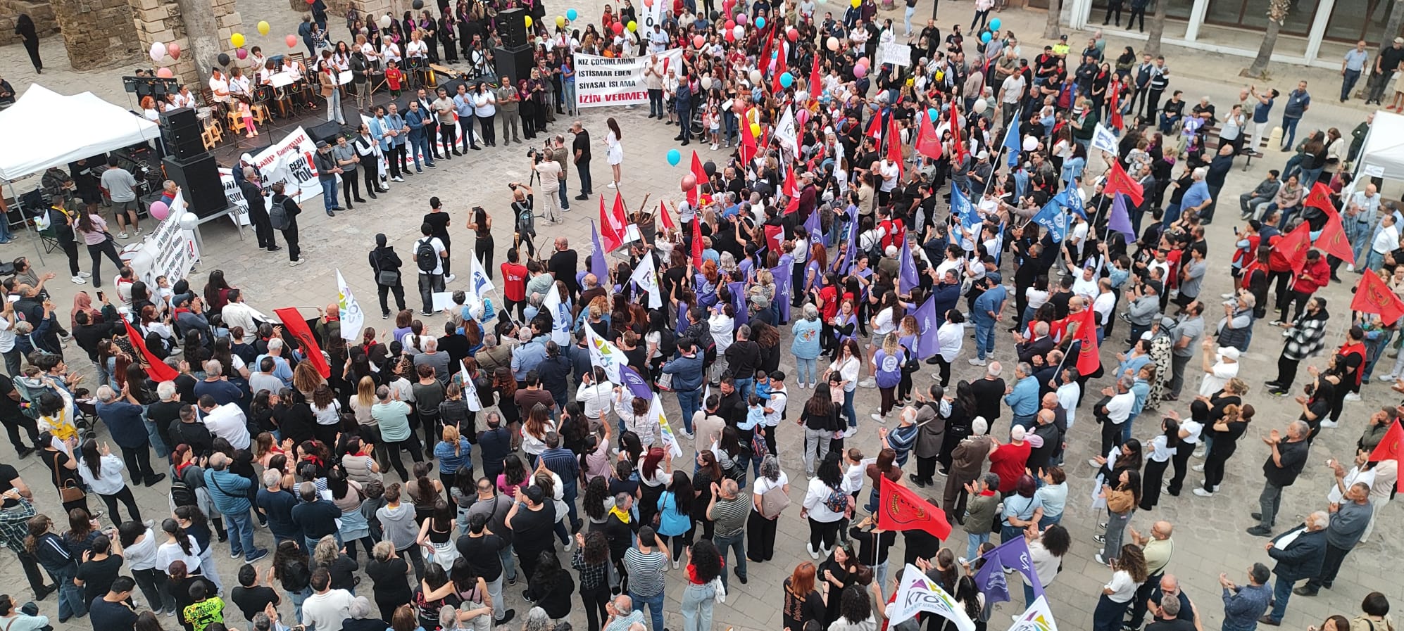 The protest was held at the town’s central Namik Kemal square, in the shadow of the Lala Mustafa Pasha mosque, with it the turn of teachers’ trade union leaders to address the crowds.