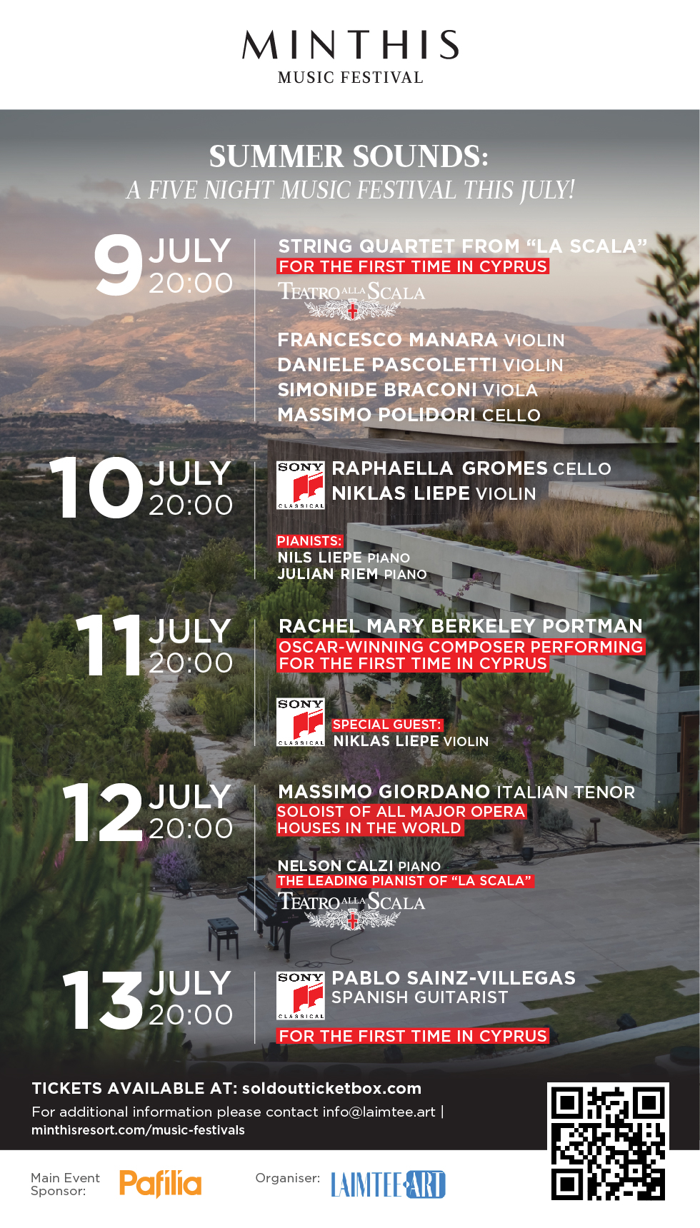 Experience the magic of Minthis Music Festival 2025, where five extraordinary nights of world-class performances will transport you to a realm of musical brilliance. This year’s festival promises an exclusive and unforgettable highlight—the Cyprus debut of the prestigious String Quartet from La Scala. Other performances will feature globally renowned virtuosos, including Italian tenor Massimo Giordano, Spanish guitar master Pablo Sainz-Villegas, La Scala’s acclaimed pianist Nelson Calzi, and Academy Award-winning composer Rachel Mary Berkeley Portman, known for the film Chocolat. Joining the lineup are German violin sensation Niklas Liepe and internationally acclaimed cellist Raphaela Gromes, both praised for their powerful stage presence and fresh interpretations of classical works. Don’t miss this once-in-a-lifetime celebration of music’s finest artists in a breathtaking setting!