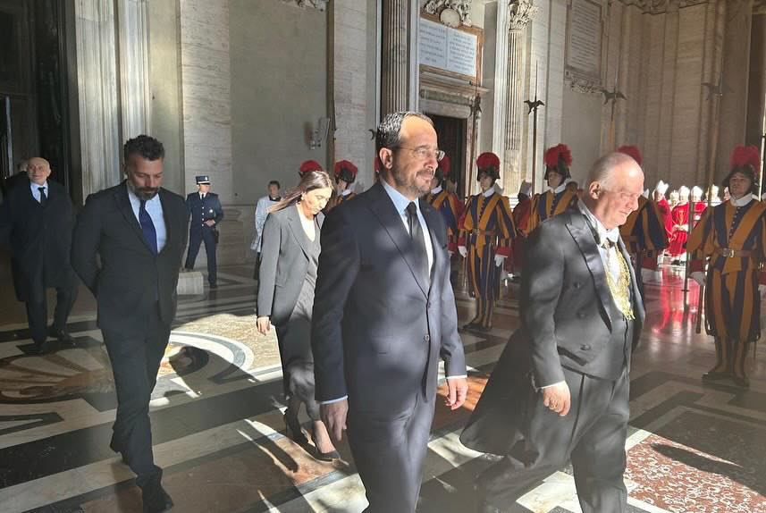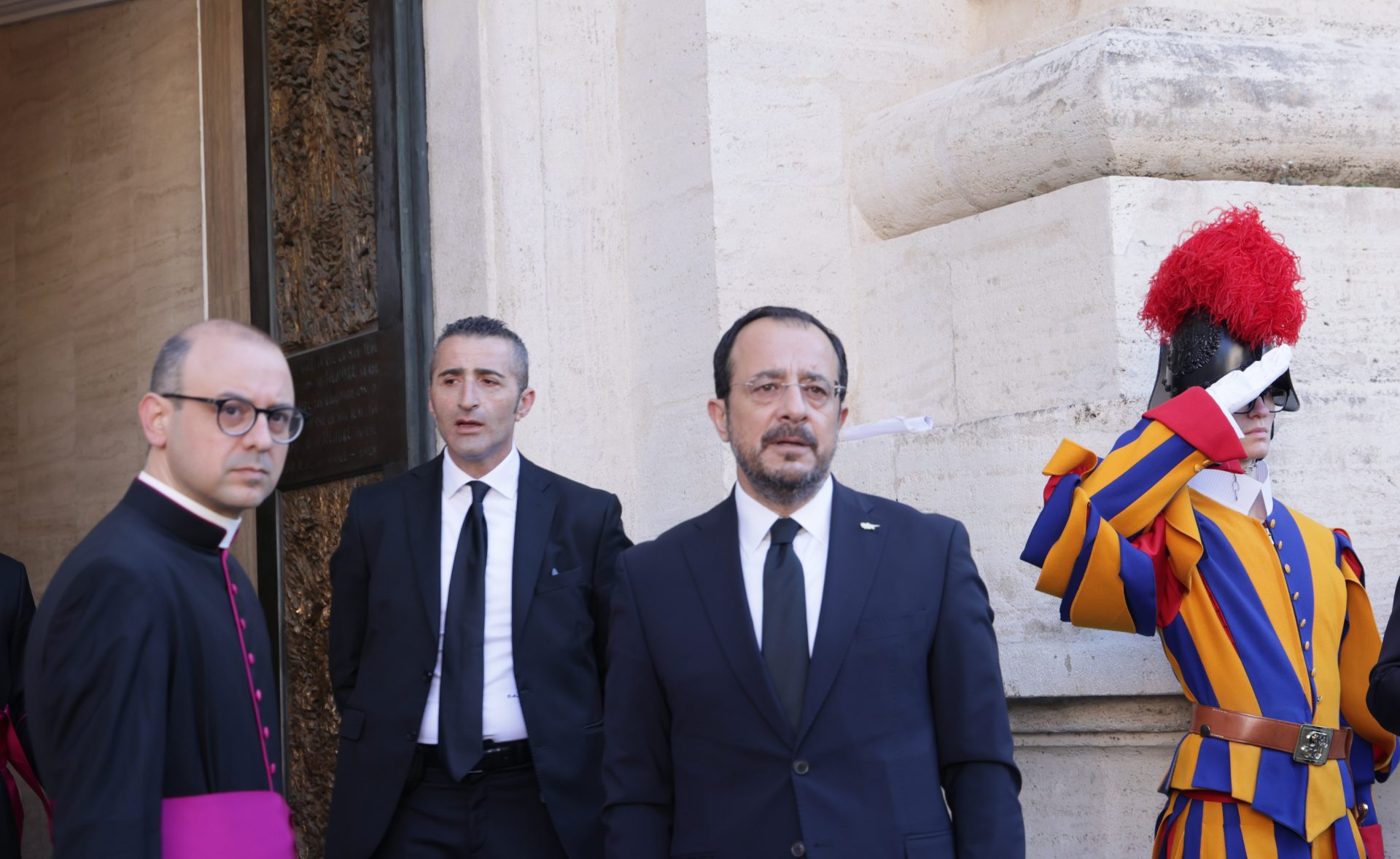 He was accompanied by Deputy Minister for European Affairs Marilena Raouna, Cyprus Ambassador to the Vatican Giorgos Poullidis, director of the president’s diplomatic office Doros Venezis, and deputy government spokesperson Yiannis Antoniou.
