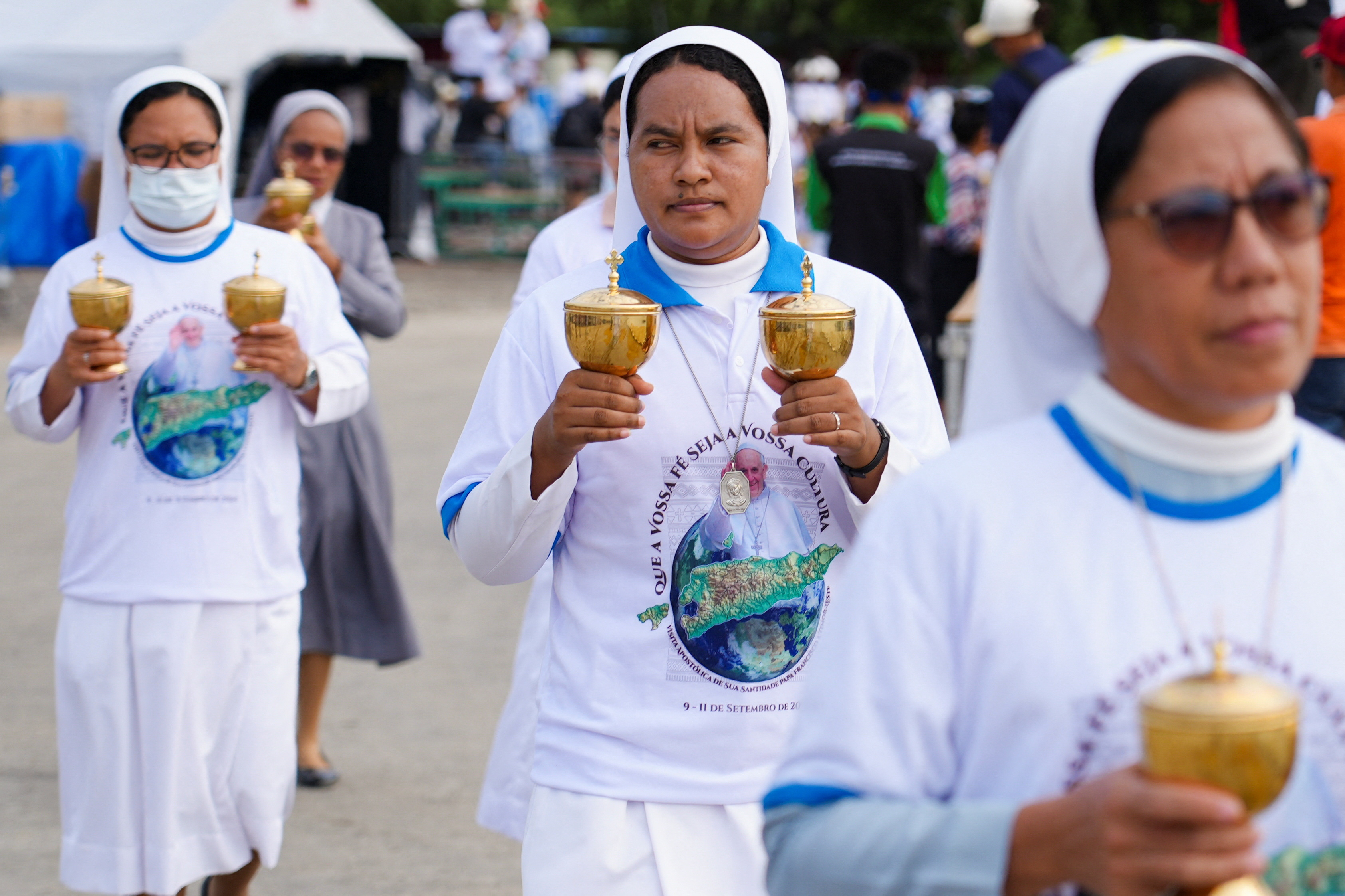 Applause rang out as Francis’ coffin, inlaid with a large cross, was brought out of the basilica and into the sun-filled square by 14 white-gloved pallbearers at the start of the Mass.
