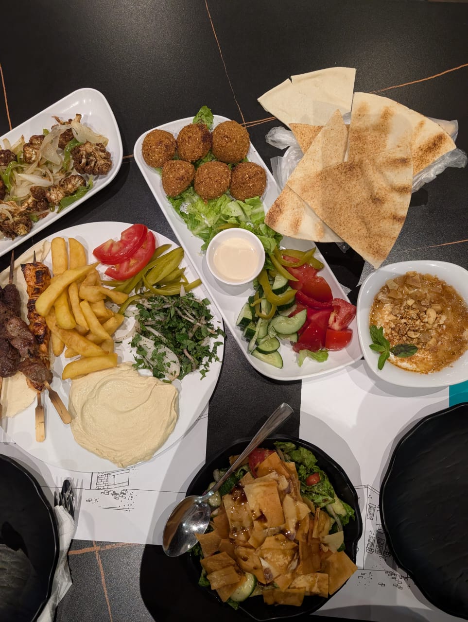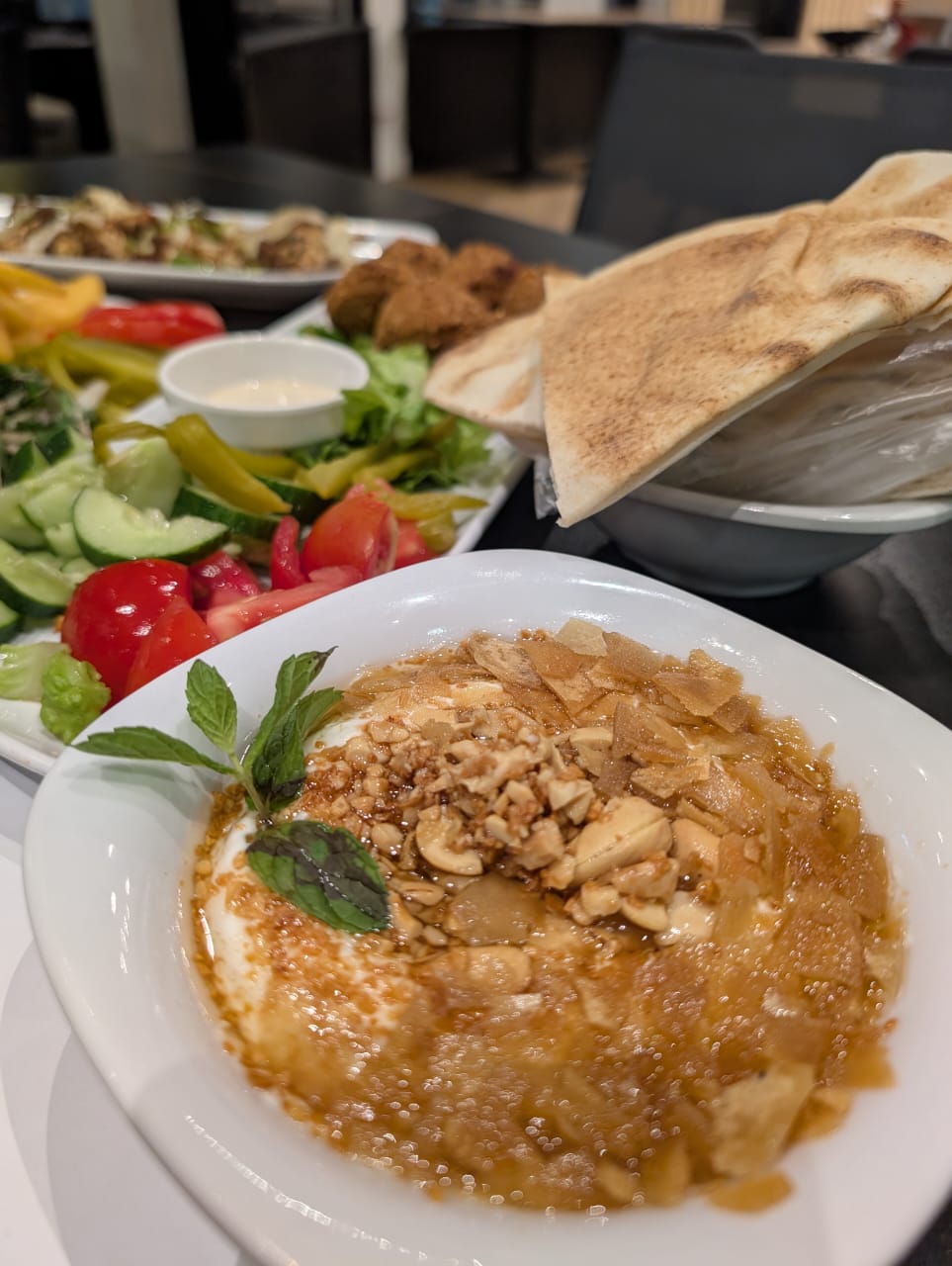 The three-skewer mixed grill (tawook, lahme and kafta) rights the ship. Juicy, perfectly seasoned, served with a side of fries and a parsley-onion mix, it’s the kind of plate that elicits a thoughtful ‘mmm’.