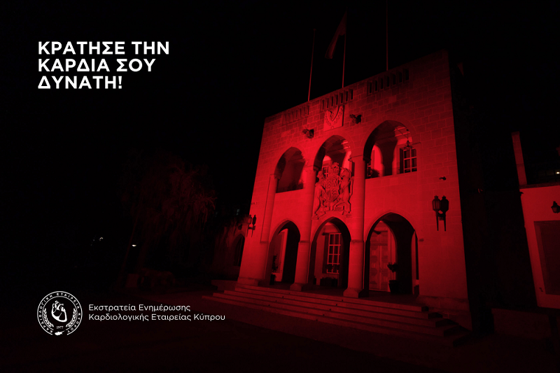 To mark World Heart Day, the Presidential Palace was illuminated in red, the colour of the heart, sending a powerful message of awareness about cardiovascular health and the importance of preventing cardiovascular disease, which remains the leading cause of death, both in Cyprus and worldwide.