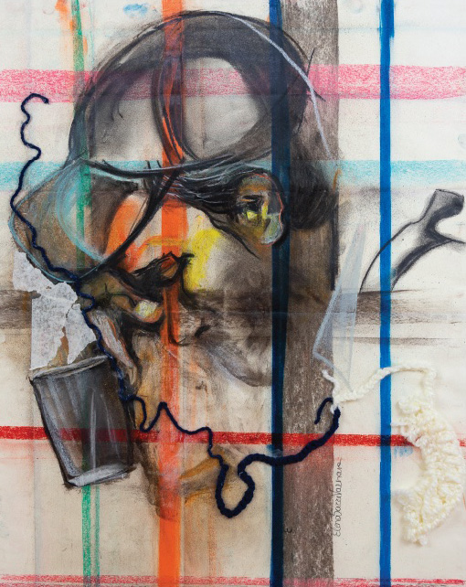 By contrast, Sarri Varnava turns her gaze inward, exploring the human being and the quiet truths often overlooked. A painter and printmaker, she draws inspiration from what most bypass: fragments of life, marginalised people or discarded materials she weaves into her work alongside watercolour, pastel, charcoal and acrylic.