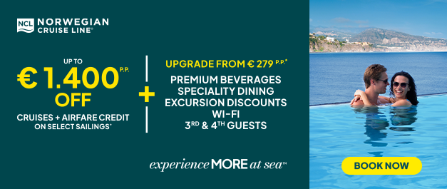 Until November 4, 2025, guests can book and enjoy up to €1,400 off on selected cruises, plus to upgrade their onboard experience from just €279 per person, and enjoy Premium Beverages, Specialty Dining, Shore Excursion Discounts and Wi-Fi.