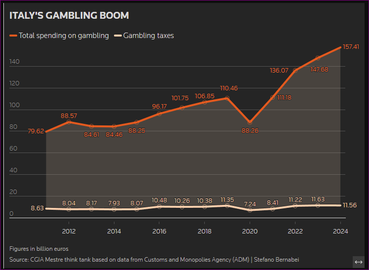 Italians’ spending on gambling has surged in the last 20 years, with year-on-year increases of more than 15% following the COVID pandemic, reaching 157.4 billion euros in 2024.