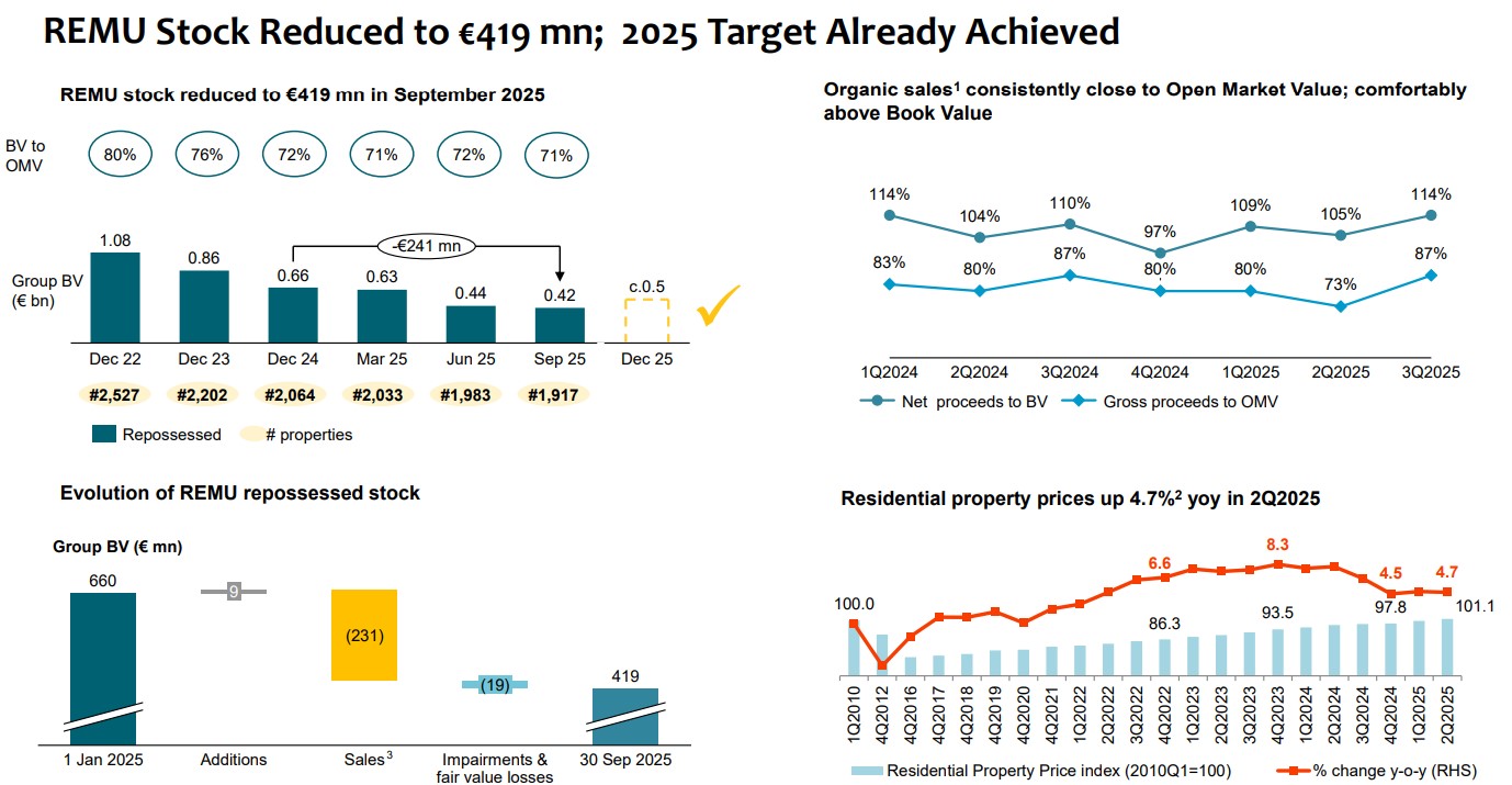 The Real Estate Management Unit (REMU), which concentrates on liquidating properties acquired through debt-for-asset swaps, has achieved approximately €1.3 billion in recovered asset sales since 2019.