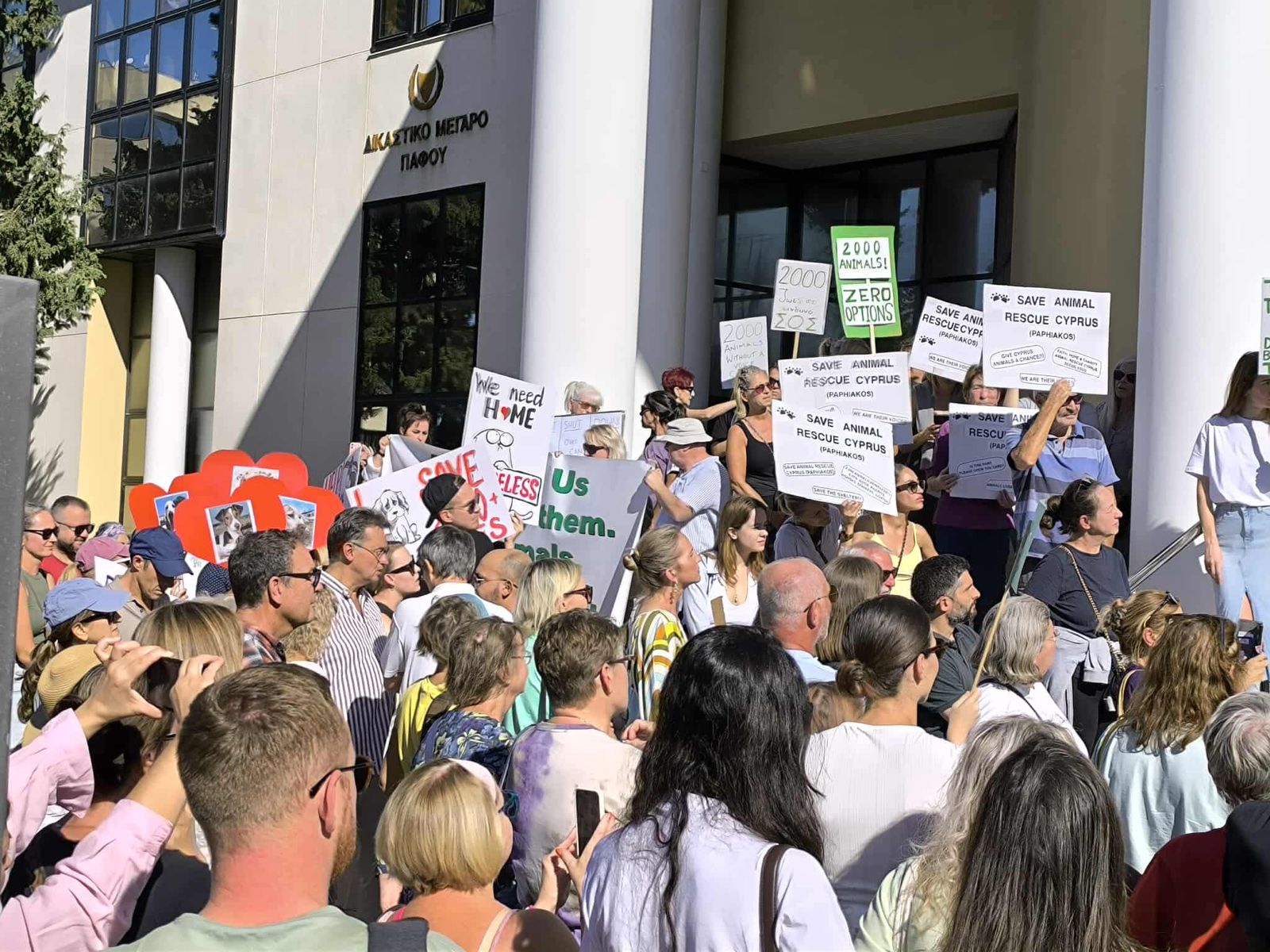 A demonstration protesting the possible removal of 2.000 animals from the Paphiakos animal shelter near Paphos took place on Friday morning outside the town’s district court. The protest attracted volunteers and members of the public, who called for the suspension of the planned shutdown.
