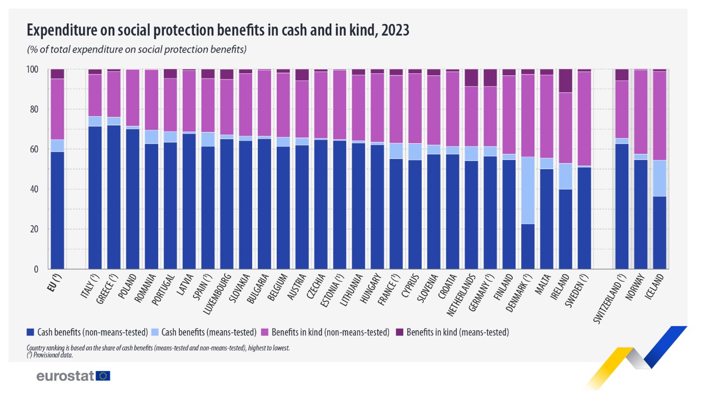 By contrast, Sweden at 51.6 per cent, Ireland at 52.7 per cent, and Malta at 55.4 per cent registered the lowest shares of cash payments, as in-kind benefits were more prominent in those countries.
