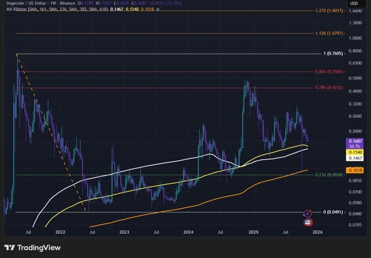 Dogecoin (DOGE) is proving its strength even as broader crypto markets face turbulence. The weekly chart highlights a recent liquidation wick finding solid support at the 0.382 Fib MA, while price has reclaimed levels above both the 0.161 and 0.236 MAs, signaling that buyers are stepping in. Maintaining the $0.14–$0.15 zone during any pullbacks keeps the bullish structure intact, suggesting DOGE could continue holding up better than many altcoins despite market pressure.