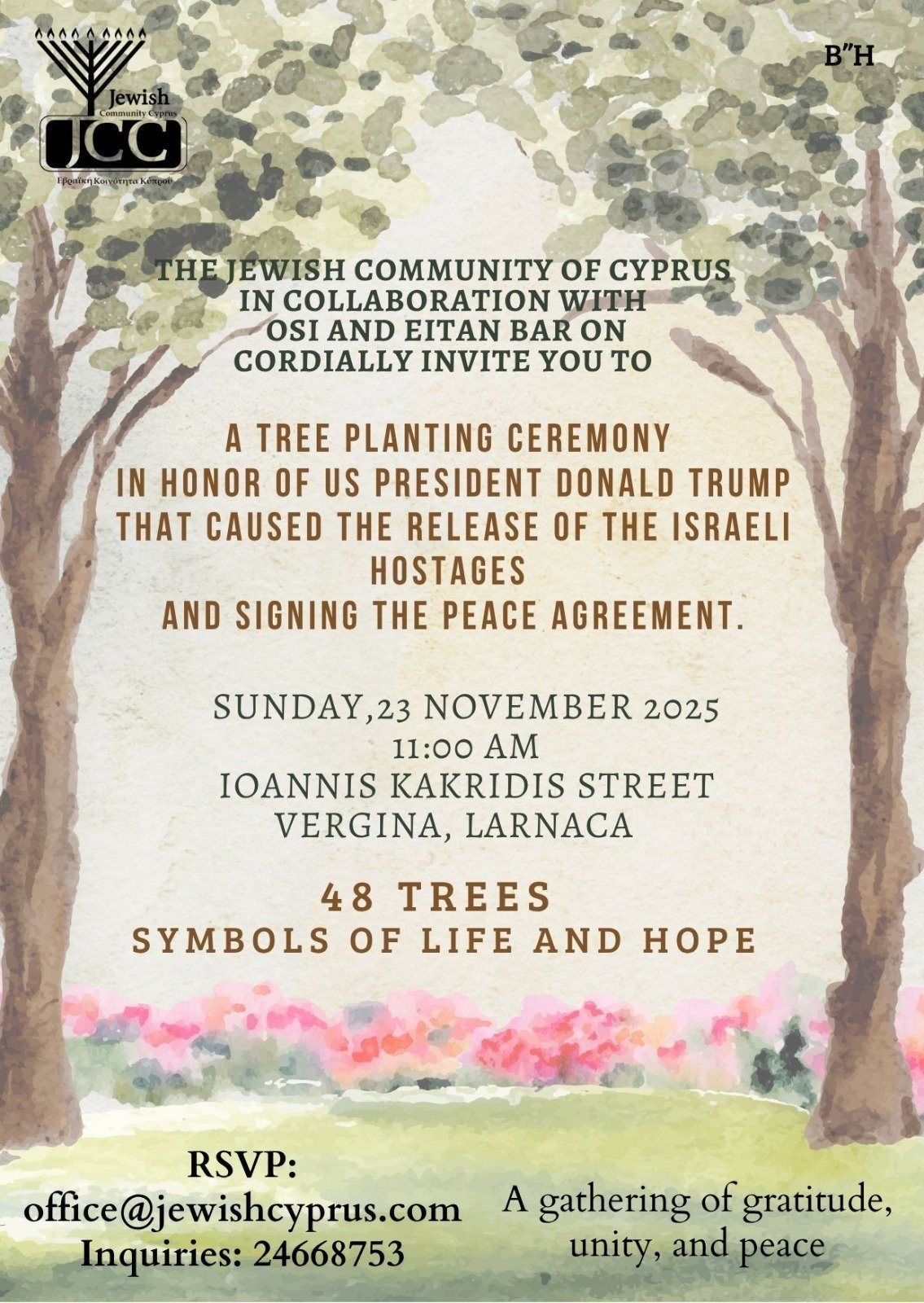 “The Jewish Community of Cyprus, in collaboration with Osi and Eitan Bar On, cordially invite you to a tree planting ceremony in honour of US President Donald Trump that caused the release of the Israel hostages and signing the peace agreement,” the invitation reads.