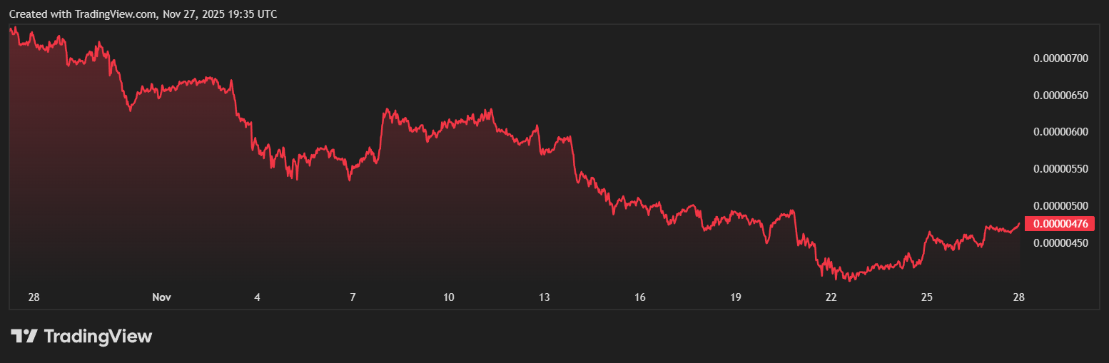 Pepecoin (PEPE) was one of the fastest-moving meme coins of the previous cycle, but its momentum has slowed sharply. PEPE trades near $0.0000045, with a market cap around $3B, and continues to hit resistance around $0.0000050 to $0.0000075.