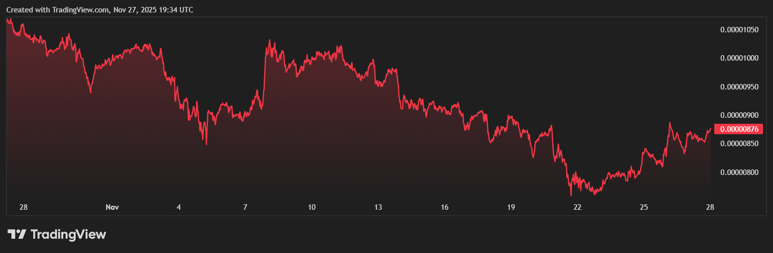 Shiba Inu remains one of the most recognizable meme tokens in the market, but its price action has struggled recently. SHIB trades around $0.0000085, supported by a market cap near $5B, yet it continues to face strong selling pressure.