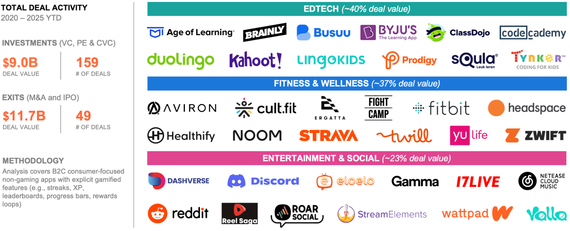 Their research examined B2C consumer-focused non-gaming apps using explicit gamified systems, covering $9bn raised across private deals and $11.7bn generated through exits, including 49 M&A and IPO transactions.