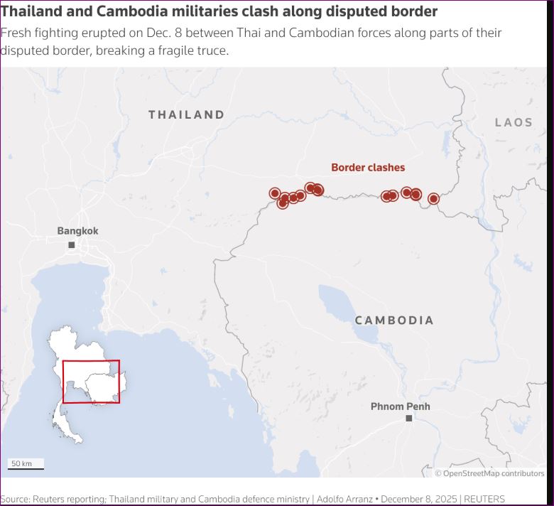 The Thai Navy said Cambodian forces were increasing their presence, deploying snipers and heavy weapons, improving fortified positions and digging trenches, adding it saw the actions “as a direct and serious threat to Thailand’s sovereignty”.