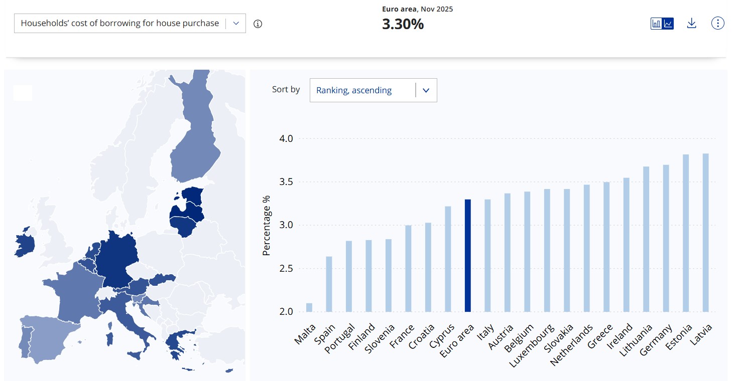 The Cyprus cost of borrowing for households for house purchase stood at 3 per cent in November 2025, undercutting the euro area average of 3.3 per cent.