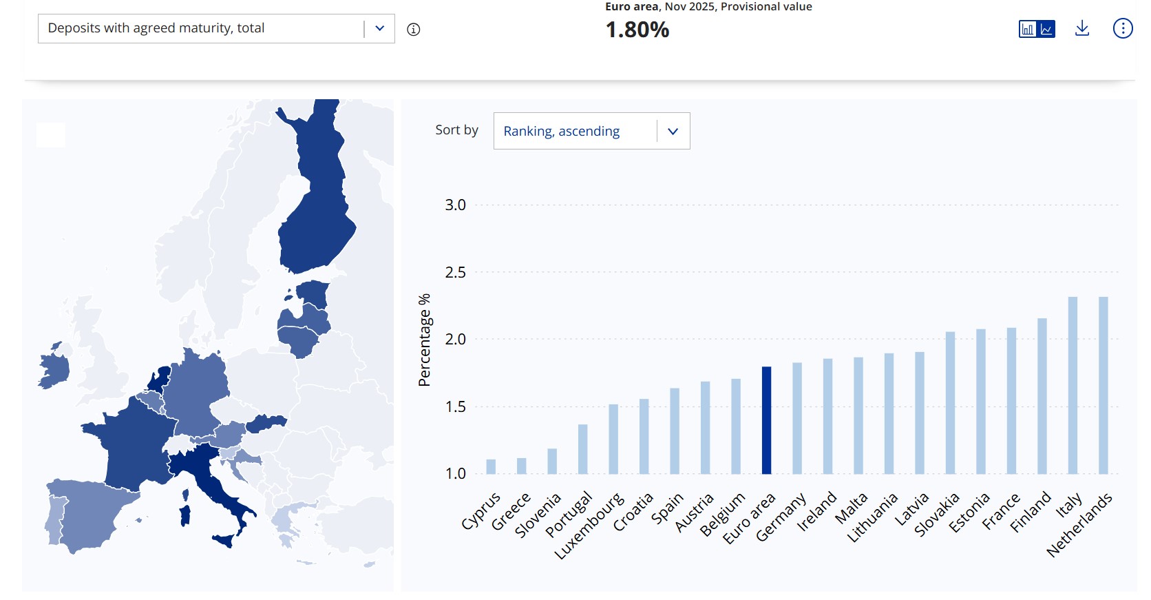 For household deposits with maturity of up to 1 year, Cyprus recorded an interest rate of 1.13 per cent in November 2025, making it the third lowest in the euro area.