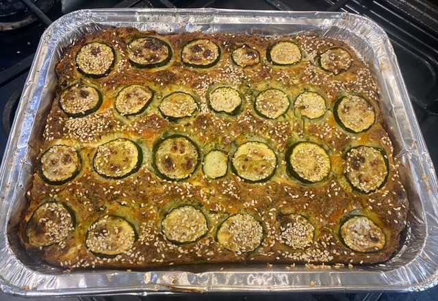 Place in a 24 x 20cm greased and floured oven tray topped with sliced courgettes and sprinkle with sesame seeds and bake for 35-40 minutes or until golden. Cool the pie for 5 minutes then, cut and serve.