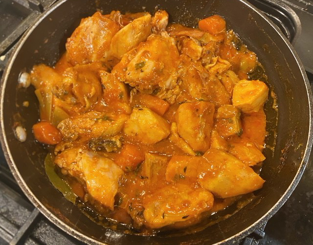 Cook the vegetables: Sauté the onions, celery, and carrots until soft. Return the chicken to the pan, then add the cinnamon stick and taro root. Season with salt and pepper, stir in the tomato purée and celery leaves, and pour in enough warm water to just cover the chicken and taro. Cover with a lid and simmer gently for about 50 minutes. Try not to stir too much, as taro can become mushy.