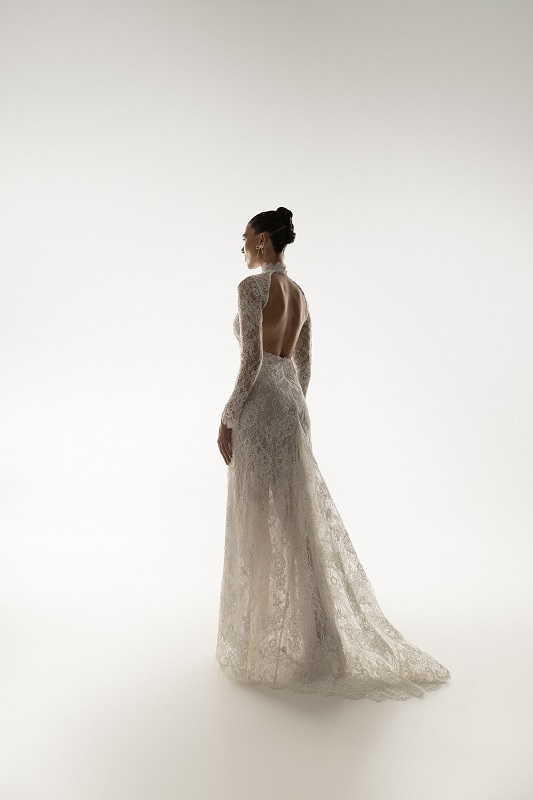 Another trend that plays a leading role is wedding dresses with a closed, high neckline, which Elena Strongyliotou combines with long, detachable lace sleeves.