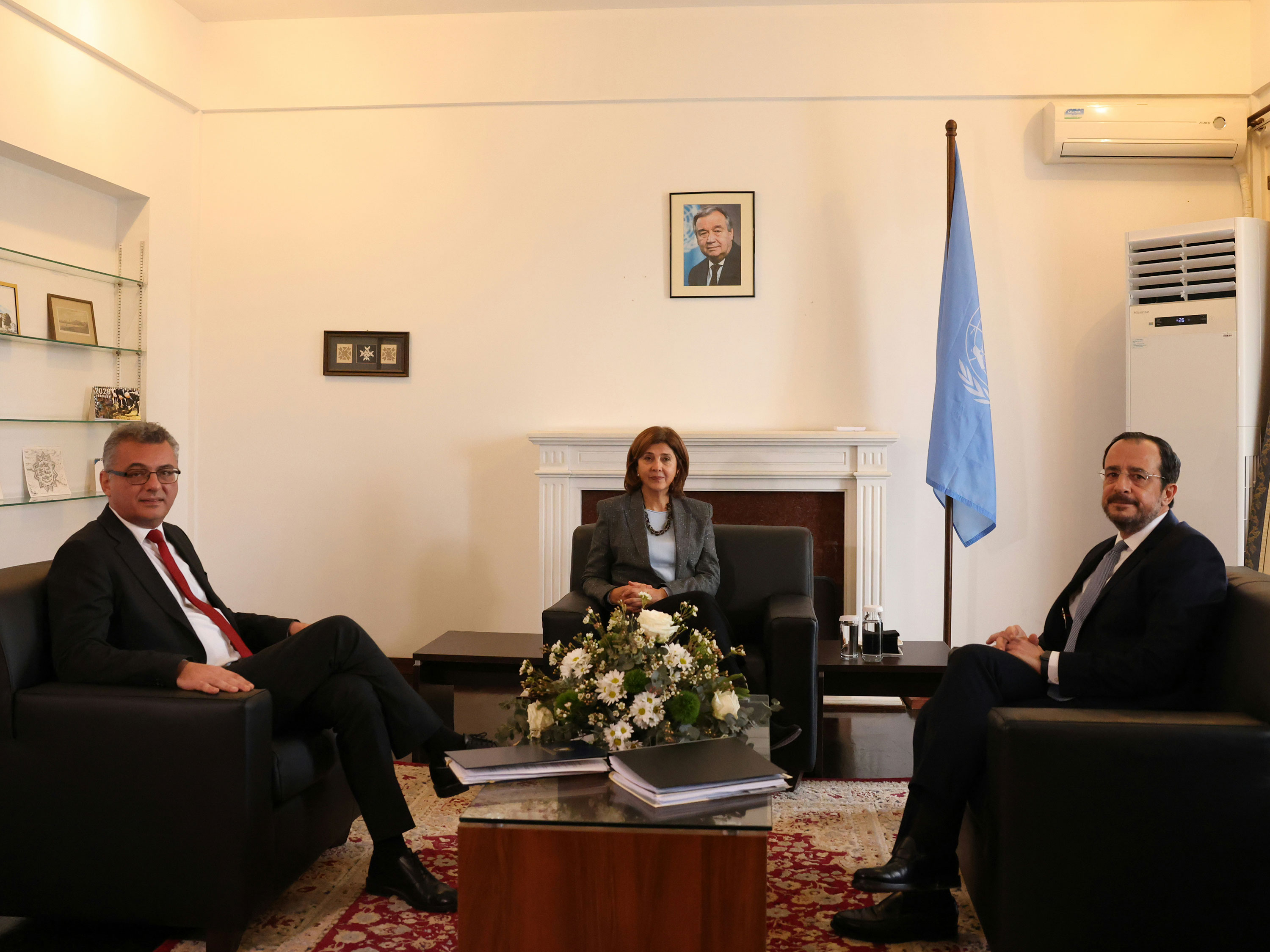 The meeting began at around 11.15am at the residence of the UN Secretary-General’s Special Representative in Cyprus Khassim Diagne, located in the buffer zone near the old Nicosia airport.
