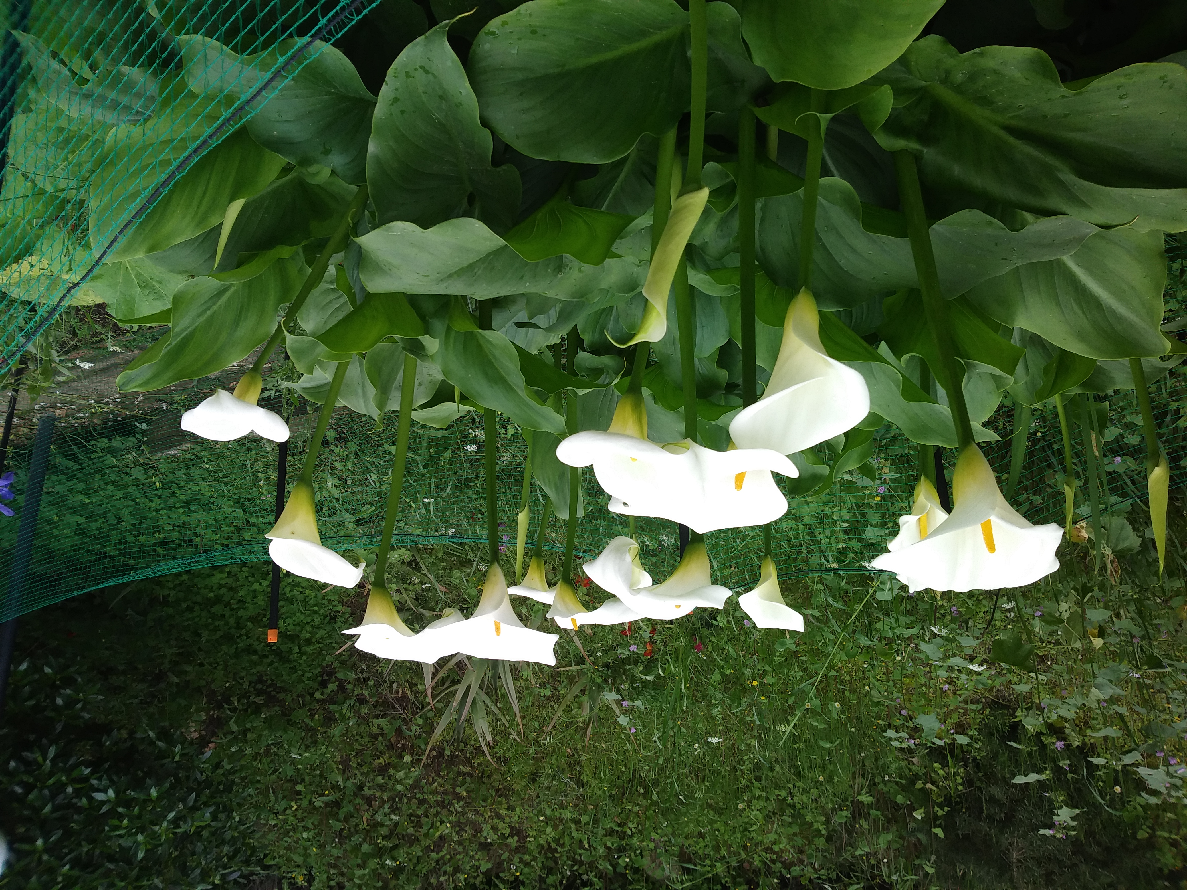 The largish green leaves help to show off the lovely trumpet-shaped white flowers, with a large spadix with tiny golden flowers arising from the centre.