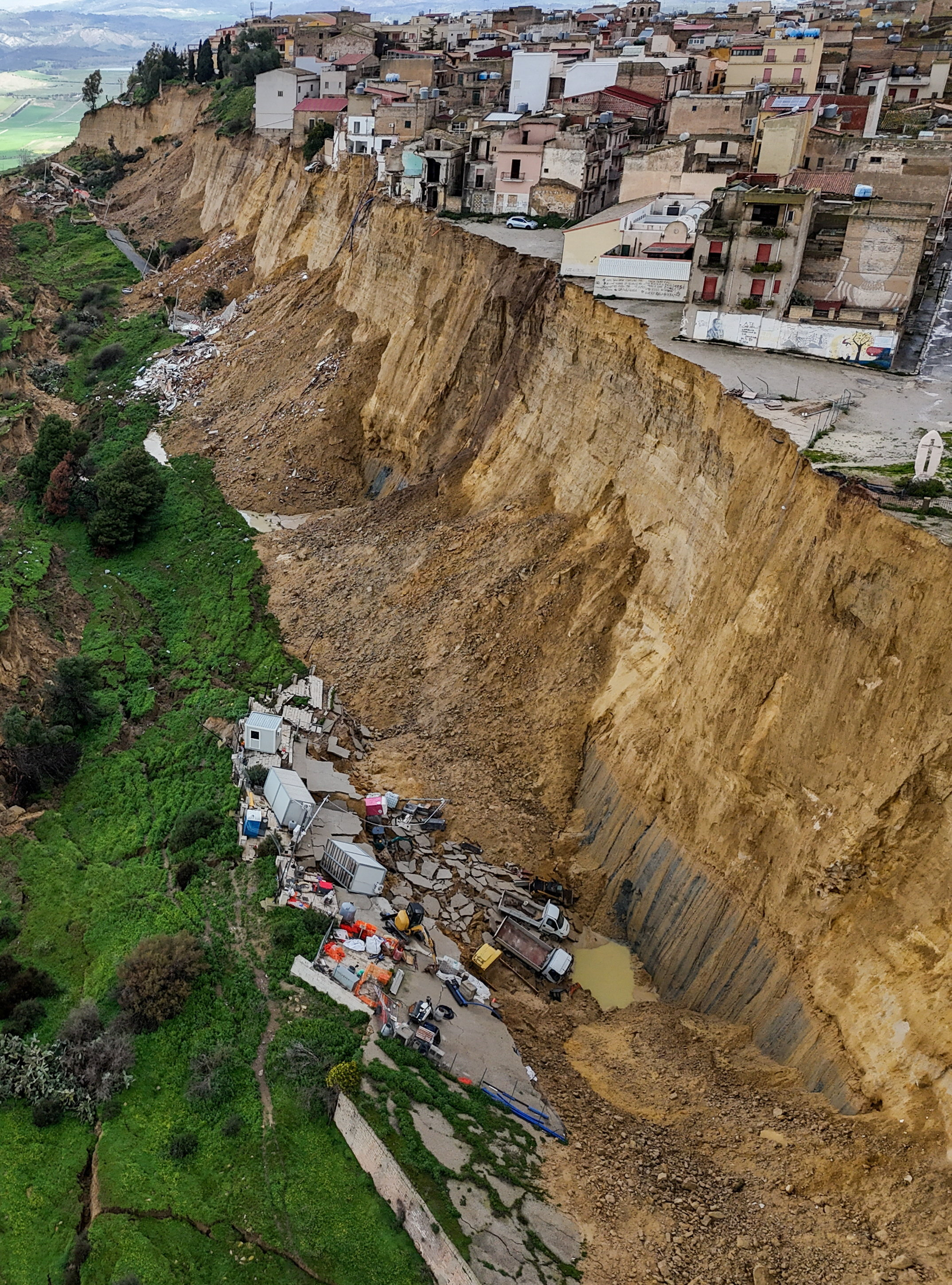 Ariel views show a dramatic beige scar down one side of Niscemi, with mounds of earth lying on the plain below, the surrounding greenfields crisscrossed with cracks and crevices suggesting the whole landscape was being torn apart.