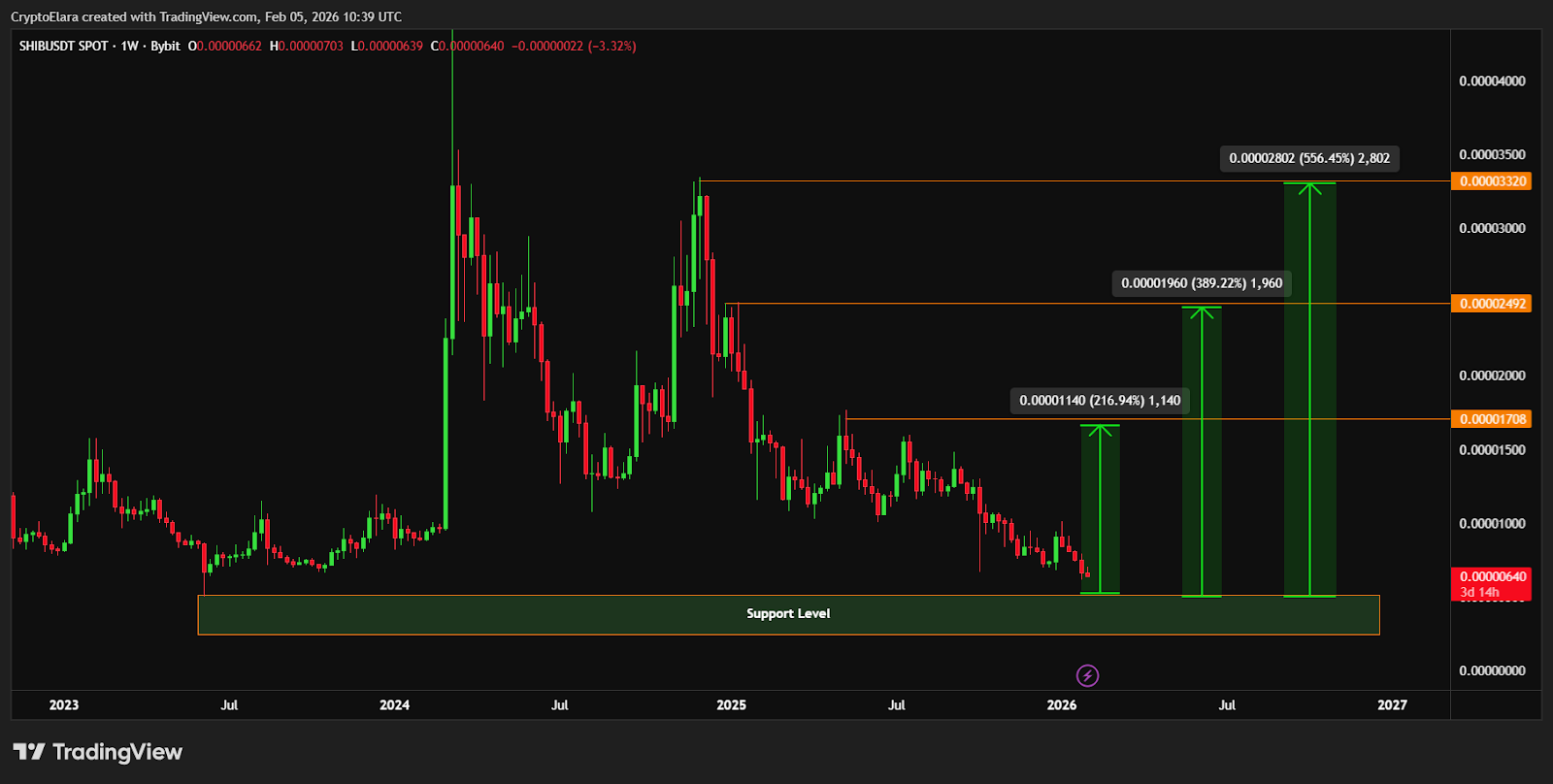 Shiba Inu (SHIB) is currently holding its weekly support around $0.00000640, showing stability after recent market fluctuations. Technical projections suggest a potential move toward $0.00003320, which would represent roughly a 556% increase from current levels. While this indicates meaningful upside, SHIB remains a more measured player in the market. Many analysts see Mutuum Finance as the top crypto option that could massively outshine Shiba Inu in 2026.