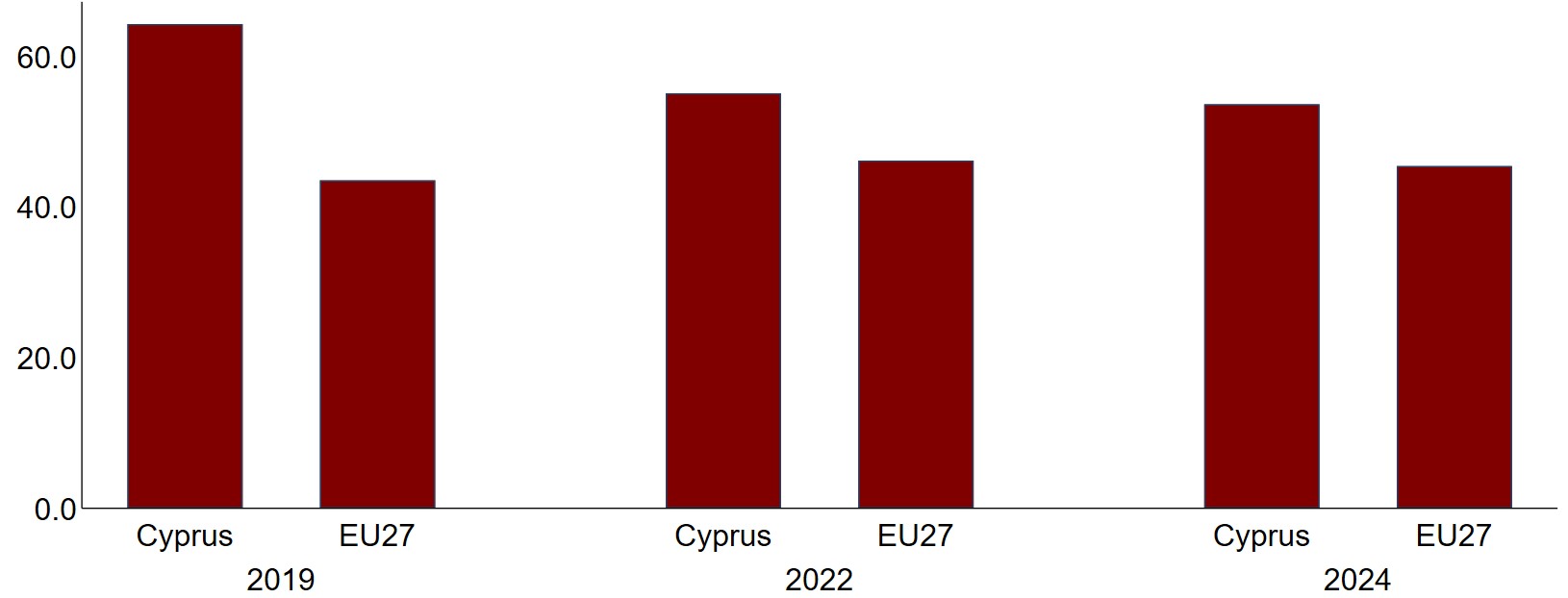Cyprus continues to exhibit high tourism intensity, measured by the number of nights spent in tourist accommodation relative to the resident population, an indicator associated with potential overtourism.