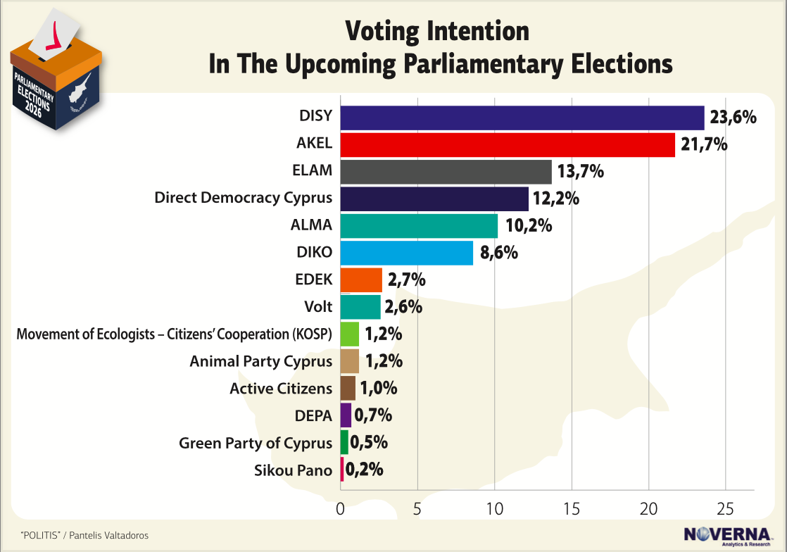 A CyBC poll conducted earlier in February shows similar trends, with Disy at 17 per cent and Akel at 16 per cent, Elam at 11 per cent, Alma at 9 per cent, and Direct Democracy of Cyprus at 6.5 per cent.