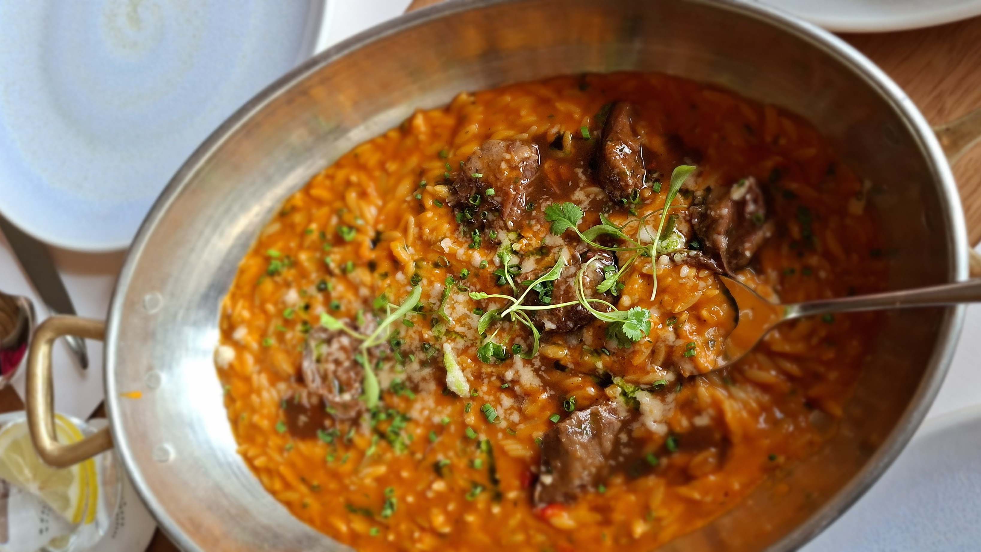For the main course, we were tempted by the Deconstructed Pastitisio but, in the end, decided to go with Greek Giouvetsi, slow-cooked beef cheeks and smoked Greek Metsovone cheese. As we were sharing, we ordered a Calamari starter with a side of broccolini. When the food arrived at the table, we realised we had ordered too much as the portions were very generous, especially the beef cheeks served in a huge copper dish with orzo pasta. There were about seven pieces of the most tender and tasty beef, on a bed of rich, creamy tomato sauce, with the strong flavours of Metsovone cheese coming through. It was excellent and truly memorable.