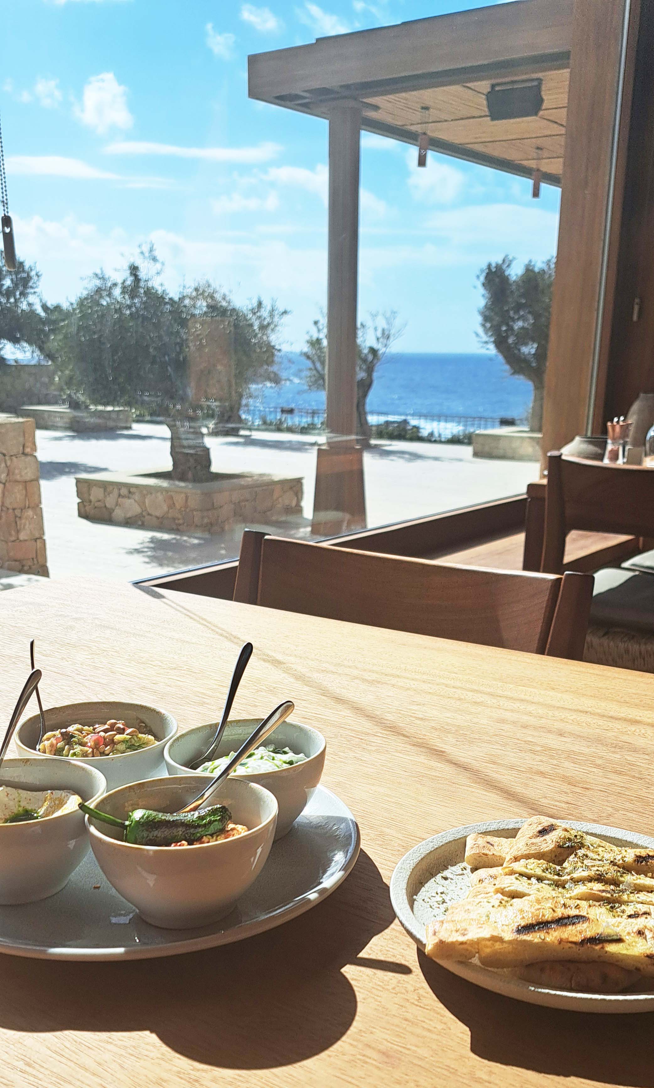 Going into the building, again, I was not sure where to go, but after a few wrong turns and a good old nosey, I eventually found Phos. The charming manager was on hand to help me choose a table, which was quite hard because all the window tables were full and I wanted a sea view. The design of the restaurant is subtle with extensive use of stone and wood, which is an obvious choice, so that the interior does not compete with the landscape and sea views. And wow, what views. Thankfully, they have incorporated huge picture windows that take your breath away. In particular, the one on the right, looking down on the Akamas, is quite possibly the most stunning view from a restaurant in Cyprus.