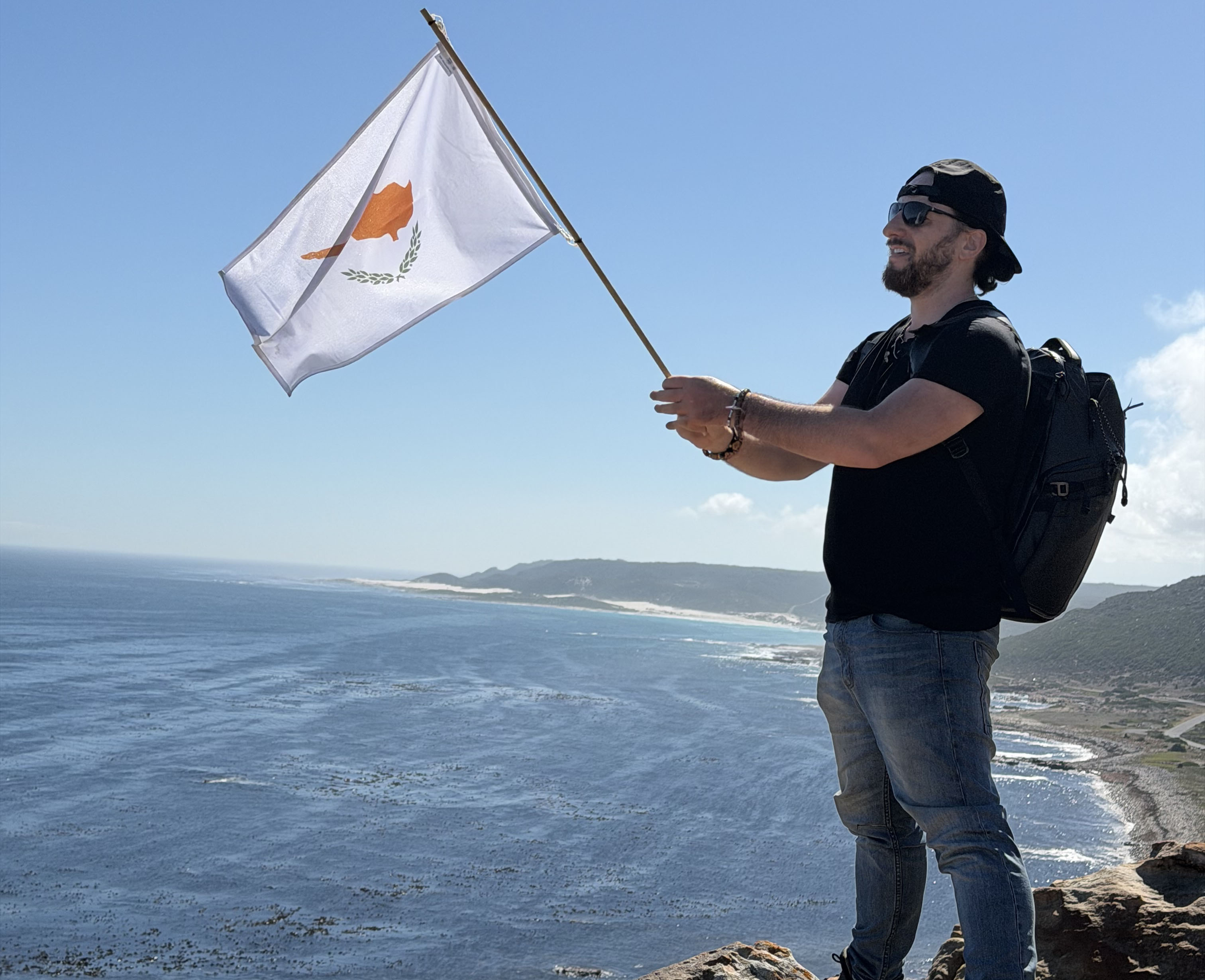 His arrival in Cape Town saw him plant a Cyprus flag there after which he will make his way back to the island.