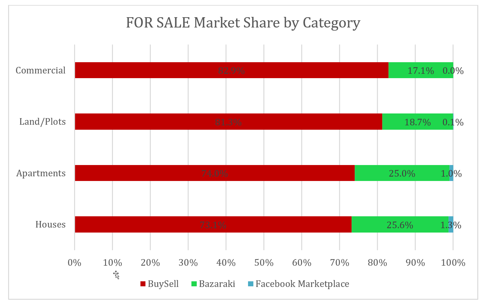- Market structure: The findings show that BuySell records the largest share in all districts and across all major categories, with particularly strong presence in Land/Plots and Commercial Properties.
